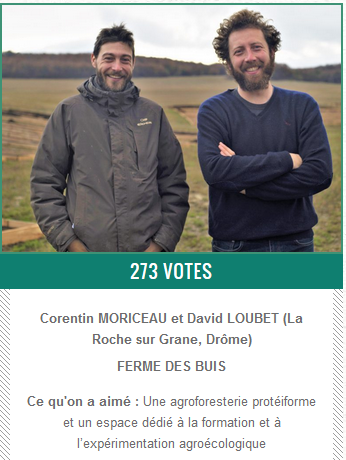 | Nous sommes finalistes du concours national pour l’agroforesterie « Arbres d’Avenir »Votre vote nous donnera les moyens de transmettre nos retours d’expérience en agroforesterie, comme je l’ai fait pour le maraichage! Votez pour nous sur : https://concours-arbres-davenir.fermesdavenir.org/ |