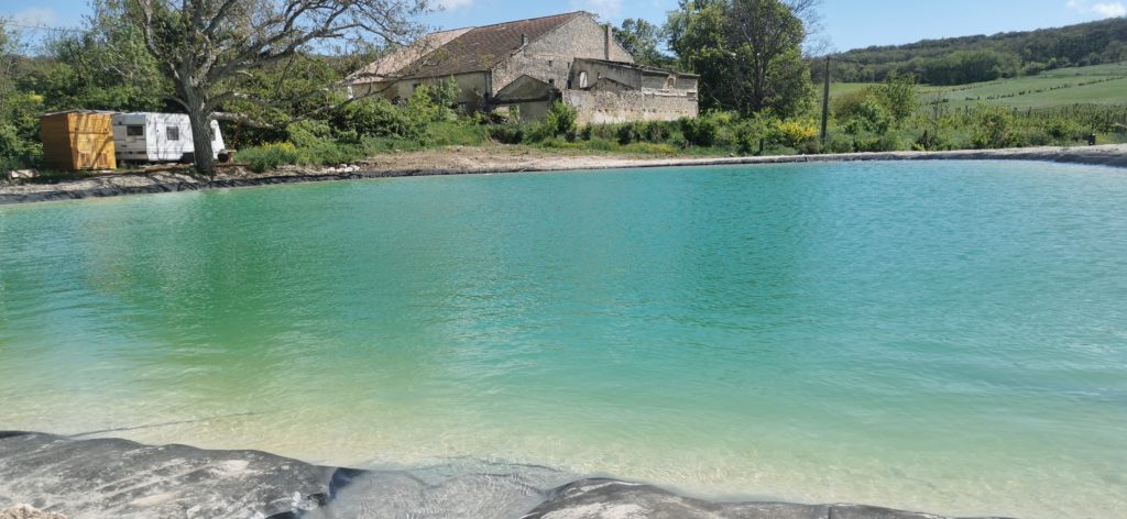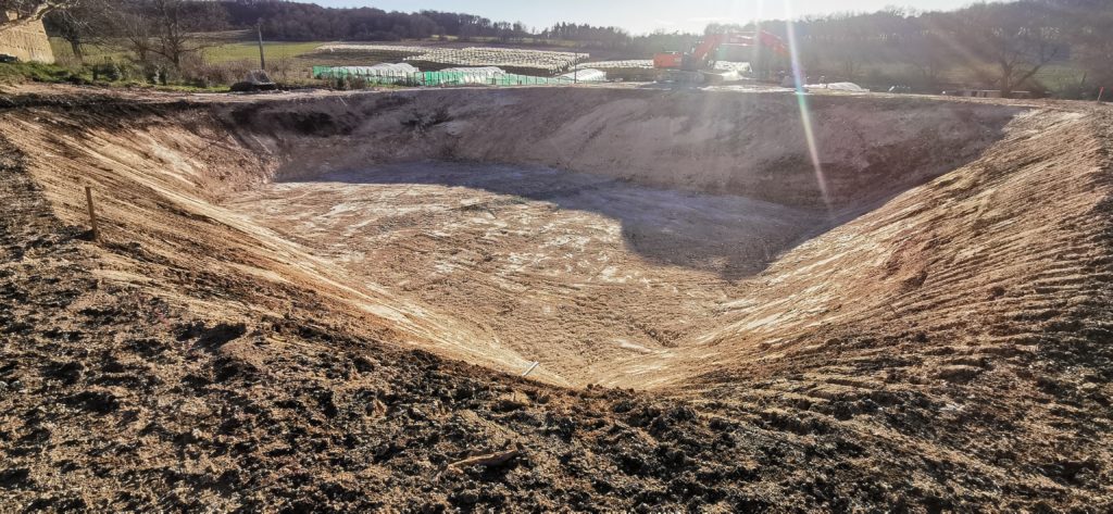 Certain.es d’entre vous le savent, nous sommes très limités en eau sur la ferme, car nous ne sommes connectés à aucun réseau d’irrigation. Jusqu’à présent nous avions une seule retenue d’eau de 1800m3, trop juste pour irriguer nos cultures avec les étés très secs de 2022 et 2023. Nous avons vécu beaucoup de stress à cause du manque d’eau, et avons dû abandonner certaines cultures d’automne. Pour développer la ferme plus sereinement, nous avons décidé de réaliser une seconde retenue d’eau, d’un volume d’environ 2500m3. Cela nous a pris du temps et de l’énergie cet hiver, avec un coût non négligeable de 38.000€ HT tout compris (terrassement et bâche EPDM). Mais cela devrait nous permettre d’envisager les années à venir plus sereinement, et de profiter du plein potentiel de production de la ferme à l’avenir.